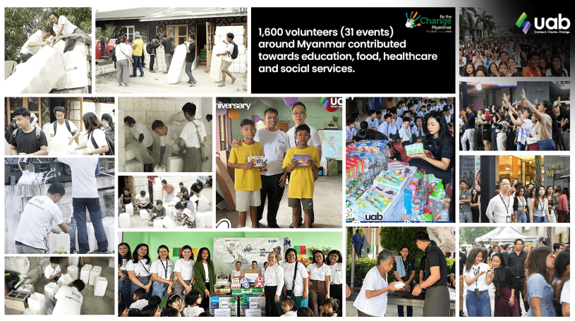 uab bank integrates Corporate Social Responsibility into the Bank’s vision and purpose. Over the past six months, they have contributed MMK 14.5 billion towards CSR initiatives. Key programs include Earthquake Relief (MMK 10 billion), the Lotus Program (MMK 159.3 million), Community Day (MMK 101.1 million), Sight for Hope providing eye care (MMK 6 million), Youthopia for youth empowerment (MMK 5 million), Insurance support (MMK 4.23 billion), the CEO Scholarship (MMK 15 million), and sponsorship of the World Robotic Olympiad National Champion (MMK 6.7 million). These initiatives have benefitted thousands across Myanmar, with an estimated impact on over 60,000 individuals. In addition, uab bank strengthened their environmental commitments by reducing carbon footprint per employee from 1.03 metric tons in FY2024 to 0.98 in FY2025, ensuring that their CSR strategy contributes to long-term social and environmental well-being. Please see our website for more information.