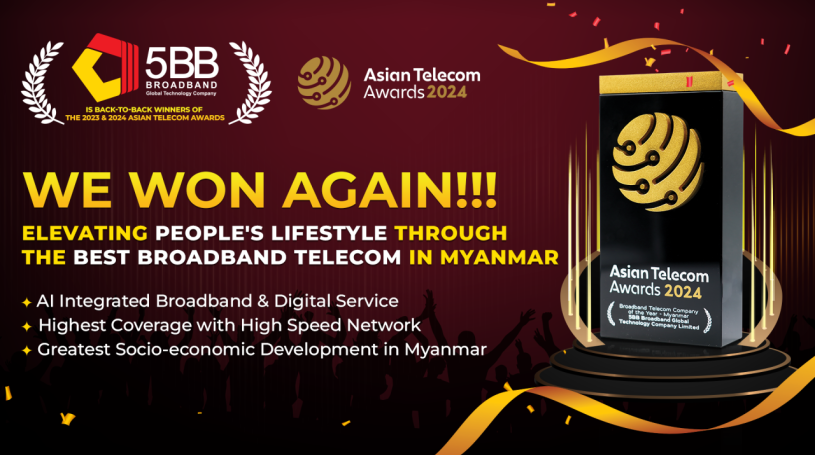 We're overjoyed to announce that 5BB Broadband has once again come out on top, claiming the esteemed Broadband Telecom Award for 2024 at the Asian Telecom Awards!π₯³ We would like to produly show off our commitment to providing super-fast, reliable, and affordable home internet across Myanmar in record time! πͺ