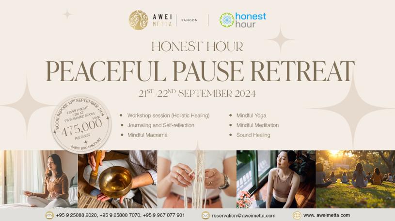 We are excited to announce the return of our holistic healing retreat, Peaceful Pause, at Awei Metta, in collaboration with Honest Hour, on September 21st and 22nd, 2024. Surrounded by the lush greenery and serene atmosphere of Awei Metta, this retreat offers a perfect opportunity to reconnect with yourself and find balance.