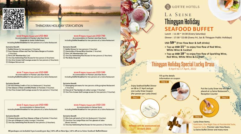 Browse a variety of special promotion from Lotte Hotel Yangon. Click here to view more details.