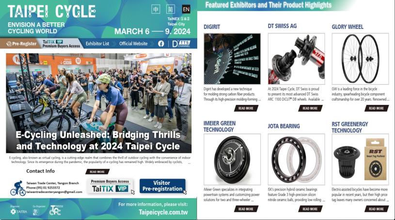 For the latest information on our exhibition schedule throughout the year, we invite you to visit our office, Taiwan Trade Center, Yangon Branch, Address: Suite No 09-03, Level 9 , Junction City Tower, Bogyoke Aung San Road, Pabedan Township, Yangon, Myanmar. Phone: (95) 01-9253372, Email: taiwantradecenteryangon@gmail.com, Website: https://yangon.taiwantrade.com
