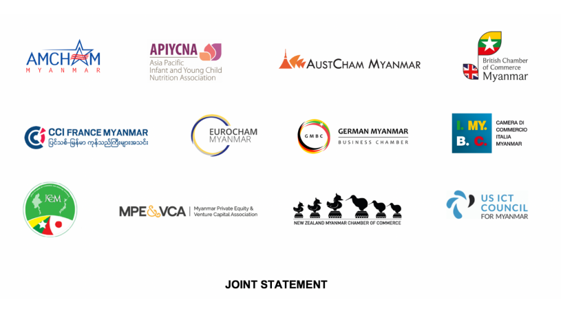 The American Chamber of Commerce in Myanmar | The Asia Pacific Infant and Young Child Nutrition Association | The Australian Chamber of Commerce in Myanmar | The British Chamber of Commerce in Myanmar | The Chamber of Commerce and Industry of France in Myanmar | The European Chamber of Commerce in Myanmar | The German Myanmar Business Chamber | Camera Di Commercio Italia Myanmar | Japan Chamber of Commerce and Industry (JCCM) | Myanmar Private Equity & Venture Capital Association | The New Zealand Myanmar Chamber of Commerce | The US ICT Council for Myanmar