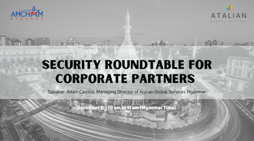 On December 2, AMCHAM Myanmar conducted a virtual security roundtable with our expert speaker and Vice President, Adam Castillo of Atalian Global Services on the security situation in Myanmar exclusively for corporate partners. We thank our corporate partners for their support this year and for joining us at this special event.