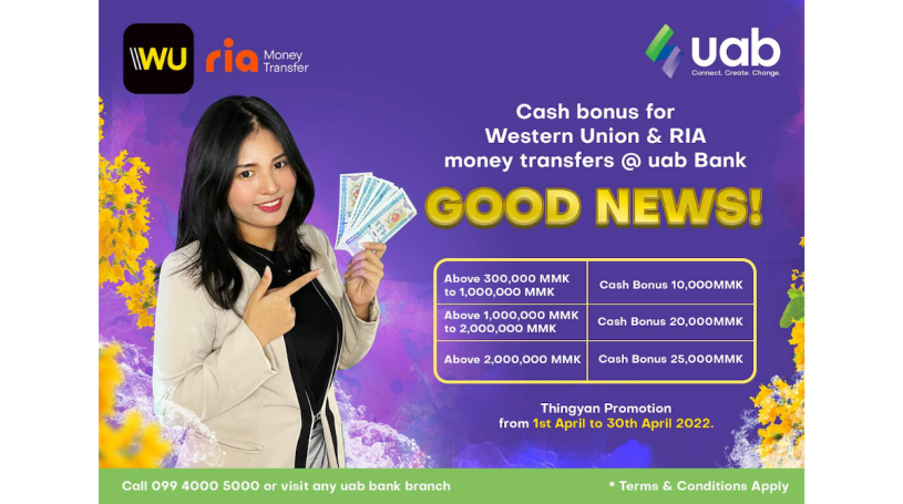 Enjoy uab bank's attractive Cash Bonus this festive season for inward transfers of above MMK 300,000