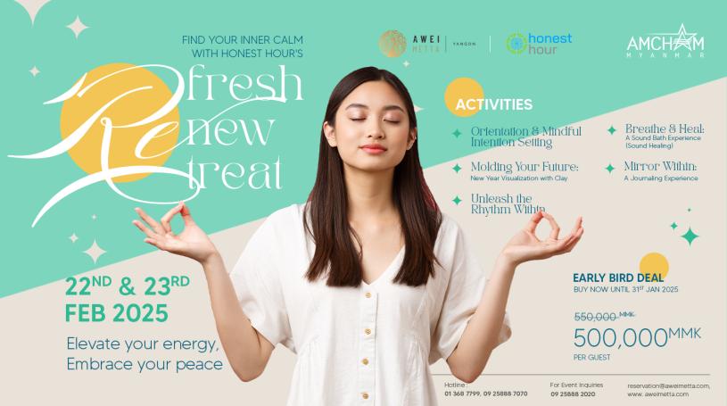 This isn’t just a getaway—it’s a chance to rediscover balance and clarity through nurturing experiences. Take advantage of our exclusive Early Bird Rate of 500,000 MMK per person, available until 31st January 2025.