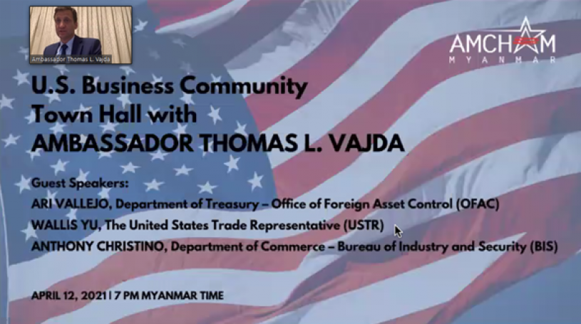 On April 12, AMCHAM Myanmar presented a special town hall by U.S. Ambassador to Myanmar Thomas L. Vajda on the current political and economic situation for members of the U.S. business community, together with guest speakers Ari Vallejo from the Department of Treasury - Office of Foreign Asset Control (OFAC), Anthony Christino from the Department of Commerce Bureau of Industry and Security (BIS) and Wallis Yu from The United States Trade Representative (USTR).