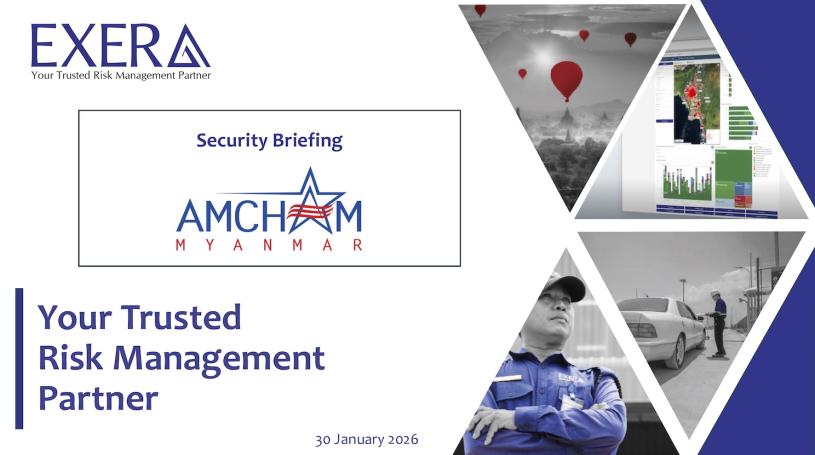 On January 30, AMCHAM Myanmar hosted a special post-election outlook briefing in collaboration with EXERA, offering valuable insights into the security implications for businesses in Myanmar. We extend our sincere thanks to Ko Aung Zin Phyo Thein, Chief Analyst of EXERA, for delivering a comprehensive briefing and for engaging with members during the Q&A session. We also thank our members for joining us, and we look forward to connecting with you again at our upcoming events.